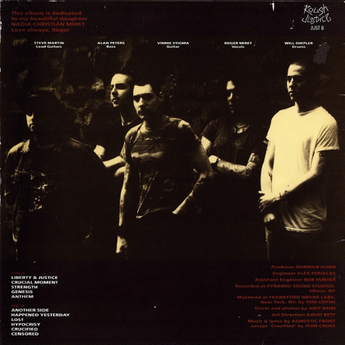 AGNOSTIC FRONT – Liberty and Justice For… (Combat / Rough Justice/ Musidisc ’87) : Bien avant que n’éclate "l’affaire Billy Milano", Agnostic Front fit les frais de semblables campagnes de dénigrement. Dès la sortie de Victim in Pain, son premier album, des bruits coururent, accusant le groupe de sympathie envers le nazisme. Il est vrai qu’Agnostic Front était, à l’origine, un groupe skin (ou, tout au moins, était considéré comme tel, ce terme n’ayant guère de sens aux USA), ce qui n’a pas arrangé son cas. Comme Suicidal Tendencies (avec Join the Army) ou SOD (avec United Forces), Agnostic Front, militant en faveur de l’unification des hard core freaks et metal heads en un seul et même mouvement, partant du principe que l’union fait la force (United and Strong), a su mettre en œuvre les quelques préceptes d’alchimie musicale régissant l’élaboration d’un cross-over hautement toxique. Brutal, mais pas excessivement speed, le hardcore d’Agnostic Front est resté très destroy à la base, sans se complaire dans une démesure des plus absurdes. A l’instar des quelques autres excellents groupes constituant la partie émergée de l’iceberg HC (le reste oscillant entre le passable et le détestable), Agnostic Front jouit d’un son bien à lui, le rendant directement et aisément identifiable par les initiés. Sa façon de placer les guitares (rappelant, comme Gang Green, le punk anglais) et ses vocaux (cette habitude qu’a pris Roger Miret d’articuler ses paroles en les crachant tue littéralement !) donnent un cachet manifestement personnel à Agnostic Front. Alors, que vous soyez positiviste, relativiste ou évolutionniste, unissez-vous sous la bannière de l’agnosticisme. Hervé S.K. GUEGANO, Hard Force n°15, février 1988.