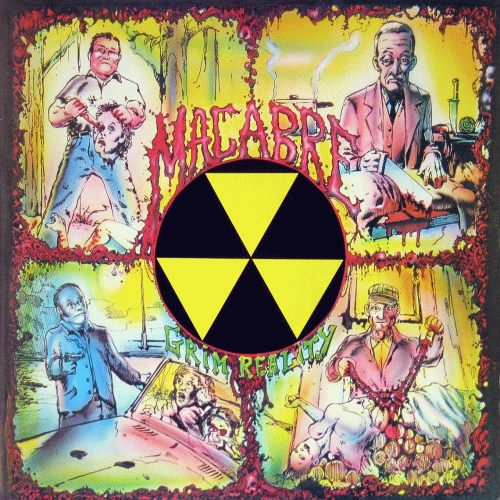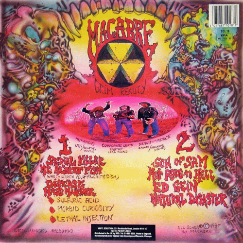 MACABRE – Grim Reality (Decomposed Recs ’87) : Un autre groupe issu de l’état de l’Illinois. Son premier vinyle est vraiment impressionnant. Les compositions sont différentes de celles des autres groupes, pas vraiment techniques mais au riffing meurtrier, particulièrement sur le titre Serial Killer. Le chant sur Corporate Death est également différent des autres, mais colle très bien avec la musique. Mr Albert Fish est un bon titre avec un refrain marrant, tandis que Mass Murder, le dernier de la face A, divisé en trois parties respectivement menées par la guitare, la basse puis la batterie, est juste chiant. La face B est bien et rien n’est à jeter. Mon reproche principal vient plus particulièrement de la médiocrité de la production. Note : 7,5/10. Ramses, Decibel of Death n°08, second semestre 1987.