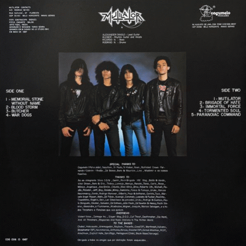MUTILATOR – Immortal force (Cogumelo ’87) : Premier album de ce groupe brésilien. Ces gars savent comment jouer du brutal death-metal mais leurs riffs deviennent vite ennuyeux. Ils sont très influencés par Slayer, ce qui saute aux oreilles à l’écoute de Memorial Stone ou Immortal Force. Si vous êtes bien branchés groupes brésiliens, ce LP tient bien son rang, pour une fois. Note : 7/10. Ramses, Decibel of Death n°09, second semestre 1987.