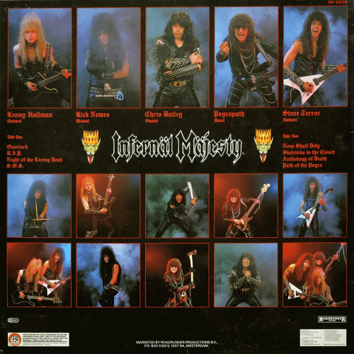 INFERNAL MAJESTY – None Shall Defy (Roadrunner ’87) : Les apparences sont parfois trompeuses. Infernal Majesty empeste le thrash nauséeux et de mauvais goût à tous les niveaux : look, attitude, pochette, nom… Pourtant, et c’est le cas de le dire, quelle puissance infernale ! A la différence du Sacrilege anglais, dont les passages lents sont la source d’un indiscutable ennui, ceux d’Infernal Majesty ne font jamais chuter l’intensité développée par les très meurtrières pointes de vitesse (boîte automatique en option). Nantis d’un bagage technique certain et de dons tout aussi évidents en matière de composition, il peut paraître incongru de le classer irrémédiablement dans le thrash, tant il est vrai qu’Infernal Majesty sort notablement des sentiers battus. Les vocaux scandés et déclamés, au lieu d’être hurlés, sont autant d’incantations (maléfiques) rendant on ne peut plus crédible la noirceur funeste d’un groupe transfiguré par l’éclat de sa musique. Et pour couronner le tout, même la production s’avère excellente, ajoutant clarté et précision aux nombreuses qualités d’Infernal Majesty. Le seul petit reproche que l’on pourrait lui faire concerne l’usage immodéré du fading, bien trop stéréotypé et indigne d’un groupe de techno-thrash inventif et original, dont les morceaux sont censés s’achever par une fin tonitruante à la crac-boum-hue, en accord avec leur structure très complexe. La profusion des breaks est une chose ; encore faut-il savoir conclure en beauté pour parachever son œuvre. Cela dit, si l’on considère que les fins occupent 5% du vinyle, il en reste quand même 95% de nature à satisfaire les plus exigeants. Hervé "S.K." GUEGANO, Hard Force n°15, février 1988.