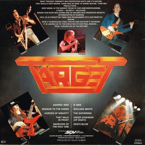 TARGET – Mission Executed (Aaarrg Records '87) : tchacapoum, tchacapoum, etc. Classique, hyper-classique devrais-je dire ! Enfin, une frite (belge) restera une frite, alors, c’est sans surprise que Target nous décoche huit titres acceptables, sans pour autant en atteindre la cible. Dans l’absolu, Target est musicalement aussi éloigné du bal musette que Slayer de Vanessa Paradis. Heureusement, le groupe possède en la personne de Lex un guitariste de talent qui, de ses soli, vient enrichir un ensemble souvent trop étouffant et monotone. Ceci dit, nous sommes ici en présence de l’exemple-type du disque jetable après usage… Vous pouvez aimer, mais de là à acheter… Sauf si vous les aimez grasses. Stéphane Girard, Hard Force n°14, janvier 1988.