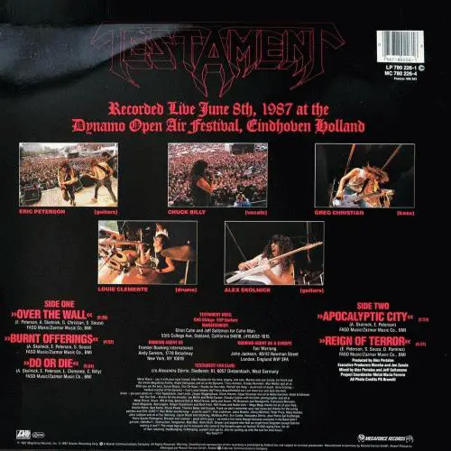 TESTAMENT – Live at Eindhoven (WEA ’87) : L’année 1987 aura décidément été celle de Testament. Après la sortie de The Legacy rapidement promu au rang des meilleurs albums, tous styles confondus, le quintette californien repart à l’assaut avec cet enregistrement live de cinq titres, capturés à Eindhoven le 8 juin 1987, pour sa première venue sur notre vieux continent. Si les versions live de Over the Wall & Burnt Offerings sont relativement conforme aux versions de l’album, Do or Die et Apocalyptic City deviennent des joyaux du thrash-metal. Les riffs plus saccadés et le chant plus hargneux tendent à restaurer la folie furieuse d’un titre comme COTLOD. Quant au morceau inédit Reign of Terror, bien qu’échafaudé sur un riff semblable à celui d’Over the Wall, il ponctue cette orgie dans la plus pure tradition du métal pétillant. Malgré quelques insuffisances rythmiques, Live at Eindhoven ne manquera pas de séduire les irréductibles métallistes, qui refusent encore de reconnaître ces thrashers fous comme les héritiers spirituels de Metallica. La 'total headbanging party' bat son plein. Phil Pestilence, Hardrock Magazine n°41, janvier 1988.