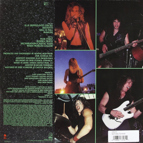 WRATH – Nothing To Fear (Enigma ’87) : Un an et demi après Fit Of Anger (premier album peu remarqué), Wrath, combo mythique des bas-fonds de Chicago, revient pour prendre une formidable revanche avec, en guise de bannière, l’un des albums les plus marquants de cette fin d’année. Possédant l’instinct du rythme saccadé et des tempos pénétrants, les musiciens de Wrath ne rencontrent pas le moindre problème pour exprimer leur intense potentiel créatif. Dans le sillage des plus subtils groupes américains (Megadeth, Overkill ou Anthrax), ils fignolent leurs compositions d’une multitude d’écarts mélodiques des plus judicieux. Derrière un chant pleurnichard mais captivant, Mike Nyrkannen et Scott Nyquist laissent parmer des guitares volubiles, cet aspect se rélévant être la preuve d’une maîtrise technique impressionnante. Supportant ce creuset d’éclairs de génie, la production place les instruments sur un pied d’égalité : la basse et la batterie se changent en deux véritables poumons rythmiques, laissant les guitares (parfois acoustiques) épancher leur soif d’agressivité. Même si les plus sectaires des métallistes rechignent à considérer Wrath comme étant un quintette susceptible de séduire les masses non speed, on n’est pas près de se lasser de cet album. Quand le speed est tiré, il faut le boire… Phil PESTILENCE, Hard Rock Magazine n°42, février 1988.