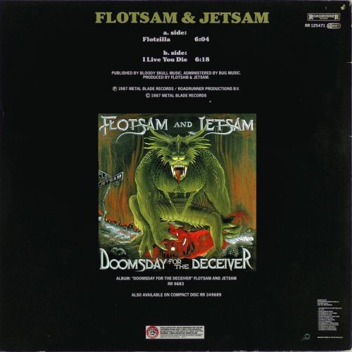 FLOTSAM AND JETSAM – Flotzilla (Metal Blade, Roadrunner ’87) : Comme on ne peut quand même pas consacrer un cinquième de page à certains albums qui, finalement, ne méritent que quelques entrefilets, il a été décidé, en notre âme et conscience, de regrouper, dans cette nouvelle rubrique, au nom si poétique des Forces Sceptiques, tous les disques de qualité intermédiaire, ne pouvant prétendre atteindre la catégorie des brutes, mais pas suffisamment déplaisants pour tomber sous le coup des truands. Et, tout d’abord, puisqu’il faut bien commencer par quelqu’un, parlons de Flotzilla, le nouveau maxi de Flotsam & Jetsam. J’ai beaucoup hésité avant de me résoudre à le traiter dans la présente rubrique. Ce n’est un secret pour aucun de nos fidèles lecteurs qu’il me faut aussi peu de temps pour me répandre en louanges sur Flotsam que pour descendre Wehrmacht. En conséquence, devrais-je vraiment chroniquer ce maxi comme un album normal, ou devrais-je plutôt le critiquer brièvement comme il le mérite ? Le dilemme fut cornélien et le choix fut douloureux. Car, malgré toute l’estime que je porte à « mon » Flotsam & Jetsam, je dois reconnaître que ce maxi n’offre que très peu d’intérêt. Sur les deux titres (seulement !) qu’il contient, l’un est un instrumental (Flotzilla) qui n’était jusqu’alors disponible que sur la version K7 de Doomsday for the Deceiver et sur lequel il n’y a rien à dire puisque vous le connaissez aussi bien que moi, et l’autre (I Live You Die) est un exemple symptomatique de l’auto-plagiat avorté. Gasp ! La chose m’est restée en travers de la gorge. Depuis que ce morceau est passé sur ma platine, je fais des cauchemars, chaque nuit, en pensant au prochain LP de Flotsam. Jason, au secours ! Reviens ! Hervé "S.K." GUEGANO, Hard Force n°15, février 1988.