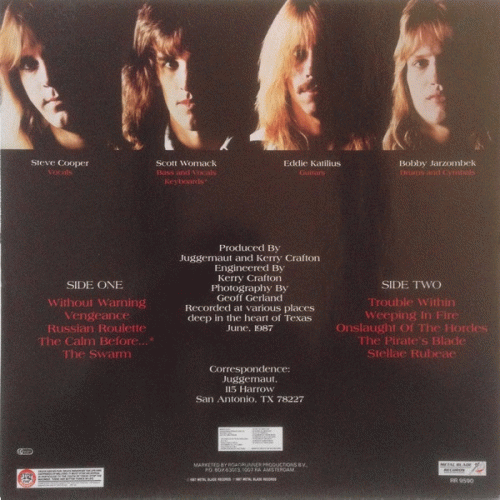 JUGGERNAUT– Trouble Within (Roadrunner '87) : si Baptism under Fire, premier album du combo Texan, n’était pas très fameux, de bonnes idées pointaient ici et là. C’est hélas toujours le même constat sur Trouble Within, renfermant deux à trois très bons morceaux tandis que le reste est à jeter. Dommage, car Juggernaut est capable de faire des choses très intéressantes comme Vengeance et Without Warning, tout en étant doté d’un très bon chanteur. Pour le reste, c’est du déjà entendu pas vraiment indispensable. 3/6. Underground Power n°04, février ’88.
