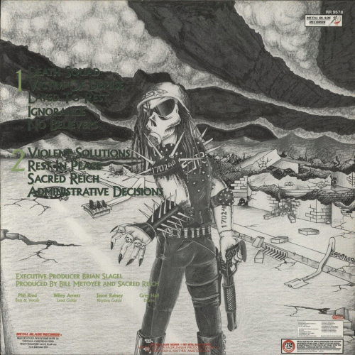 SACRED REICH – Ignorance (Metal Blade / RR ’87) : Qu’en est-il exactement de la situation du thrash ? Alors que la passion des extrêmes joue un rôle prépondérant, attirant les uns vers un hard core trop jusqu’au-boutiste pour être audible, et les autres vers un thrash tellement sophistiqué qu’il vaut à ses auteurs le désintérêt d’une partie de l’auditoire. Certains groupes, dont Sacred Reich, tentent encore de parvenir à un compromis assez attractif. Les influences HC chez Sacred Reich sont plus qu’évidentes, même si ses guitares ont un timbre moins grave que celles des formations 100% hard core ; ce genre de rythmiques ultra-rapides ne trompe pas. D’autre part, les propensions mélodiques de Sacred Reich sont très limitées, mais réelles ; tout au plus peut-on relever certaines ressemblances de construction (surtout sur l’instrumental Layed to Rest) avec Flotsam & Jetsam, ce qui n’est pas déplaisant ! De plus, avec ce que vous savez des prestations intérimaires du bassiste et du batteur au sein de divers groupes, et non des moindres, il n’est guère étonnant que ceux-ci maitrisent superbement leurs instruments respectifs, tout comme les guitaristes, d’une dextérité redoutable. Reste la voix (du bassiste), acceptable, mais interchangeable à volonté. Tout cela est très bien fait, tape fort et juste, mais il manque le petit grain de sel dans la mécanique, qui transforme ces singuliers objets discoïdes, noirs & plats, en lames de scie circulaire. Hervé "S.K." GUEGANO, Hard Force n°15, février 1988.