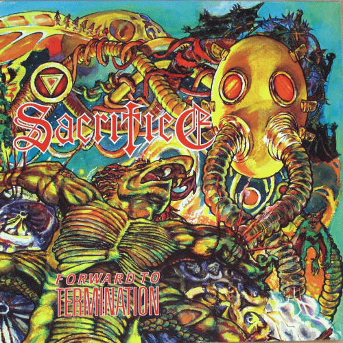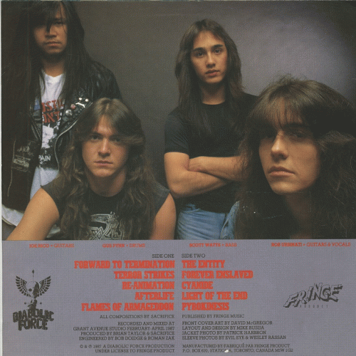 SACRIFICE – Forward to Termination (Diabolic Force ’87) : purée, cet album est genial ! Forward to Termination se hisse parmi les meilleurs albums thrash et cette année. Sacrifice a énormément progressé depuis son premier LP Torment in Fire (1985), qui était déjà un bon album, farci de changements de tempos et de riffs meurtiers. Cela dit, Forward to Termination est cent fois supérieur. Ses morceaux sont plus lents (exception faite de Pyrokinesis) mais ils sont plus lourds, plus complexes, et sont dotés de meilleurs arrangements et d’une meilleure production. Re-animation, Flames of Armageddon ou The Entity sont des morceaux carrément meurtriers. Le chant de Rob Urbinati est meilleur, plus mélodique, tandis que les deux guitares de Rob & Joe envoient de sacrées rythmiques & leads, et que les parties du batteur Gus Pynn sont démentielles. Ce gars est certainement le meilleur batteur de thrash aux côtés de Dave Lombarbo, Gene Hoglan et Wayne Hartsell. Sacrifice est certainement le meilleur groupe de thrash canadien et j’espère que son troisème LP sera encore plus complexe. 10/10 Ramses, Decibel of Death n°08, second semestre ’87.