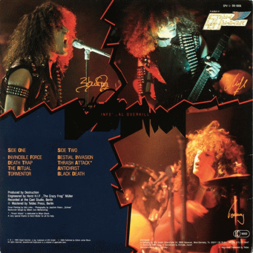 DESTRUCTION – Infernal Overkill (Steamhammer '85) : Voici le premier album de Destruction, digne successeur de son mini LP Sentence of Death. Ce groupe est l’exemple type de la vague speed thrash d’outre-Rhin. Rien de bien nouveau en dehors du jeu de guitare à la fois maniaque et bien enlevé de Mike en solo (The Ritual ou l’excellent Tormentor). L’instrumental Thrash Attack est un peu décevant, tout comme Antichrist, mais le reste comblera les inconditionnels du genre. Avec le temps, Destruction semble se rapprocher de Slayer.