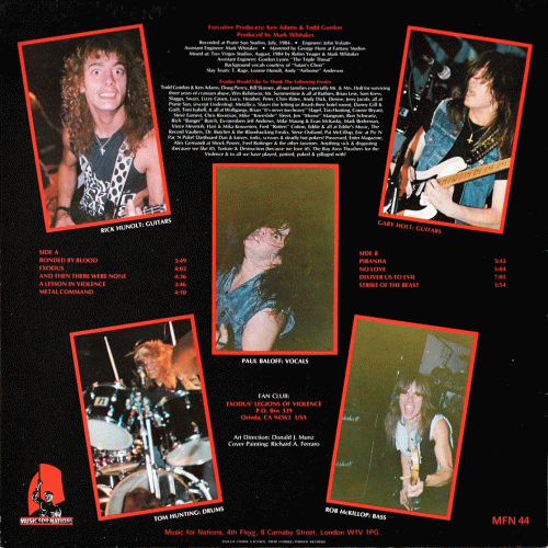 EXODUS – Bonded by Blood (Music for Nations '85) : Sur le fil du rasoir. Issu de San Francisco, le groupe fétiche de Metallica débarque avec un premier album en tout point fantastique : un coup d’essai et un coup de maitre. Neuf morceaux hérissés de riffs speedés composent ce brûlot vinylique. Le style d’Exodus rappelle étrangement celui du célébrissime Metallica, chose peu surprenante car son soliste fut un temps guitariste d’Exodus. Précisons toutefois qu’Exodus a vu le jour avant Metallica. Propulsé par une section des plus belliqueuses, les deux guitaristes Rick Hunolt et Gary Holt assurent leurs soli étourdissants de puissance et de virtuosité avec une précision chirurgicale. Quant au chanteur Paul Baloff, il n’est jamais en reste, relaçant sans cesse la machine grâce à une voix râpeuse et pleine de hargne. Impossible de dégager un morceau de cet Everest flamboyant, ce serait faire injure aux autres. Avec un tel chef d’œuvre, Exodus vient d’entreprendre la conquête du monde. Me concernant, Bonded by Blood restera quoi qu’il arrive l’album de l’année. A se procurer d’urgence. Indispensable.