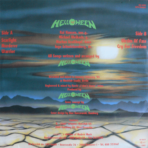HELLOWEEN – S/T (Noise '85) : Comme d’habitude, nos cousins germains ne nous ont pas oubliés, avec ce mini-LP d’Helloween sorti sur l’excellent Noise Records, l’un des meilleurs labels indépendants du moment, qui voue une passion au heavy-métal turbo compressé. J’aime beaucoup le style de ces teutons, même si sur Starlight et Murderer, on ressent trop des influences Maiden. Les autres titres sont très thrash avec de belles parties instrumentales. Un mini-LP brillant, et vivement le premier album qui sera sans doute un meilleur reflet du fiel métallique d’Helloween.