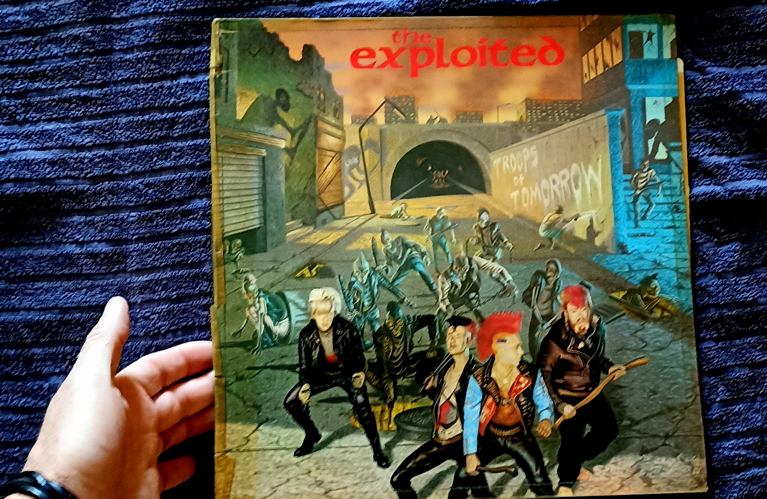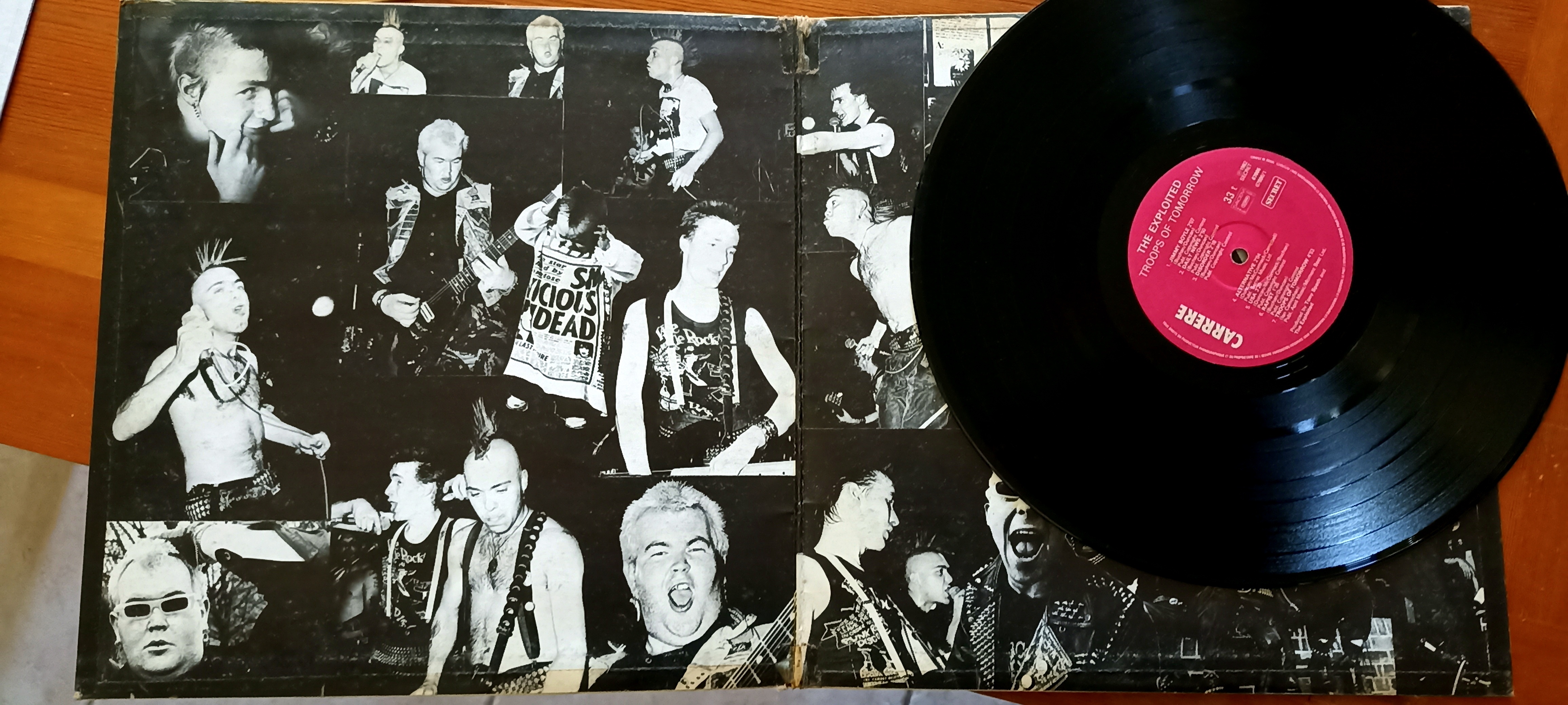 C'était au milieu des années 80. Je me baladais au marché en quête de quelques victuailles, lorsque par le plus grand des hasards je tombe sur l'étal d'un particulier qui vendait un peu tout et n'importe quoi. En fouillant entre les choux et les patates je tombe sur ce 33 tours du groupe The Exploited que je ne connaissais pas...J'ignore si c'est collector mais il compte pour moi car en plus d'être un excellent disque Punk, il m'a permis de rencontrer un ami qui m'en présenta d'autres...etc. Belle époque ! La pochette s'ouvre, on peut y voir Wattie et sa bande qui font les singes..