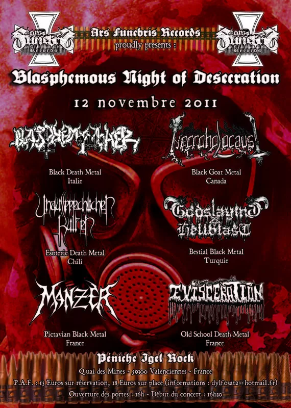 Pour Ars Funebris, je n'ai pas un gros souvenir de son catalogue. Par contre, j'en garde un très bon de son unique concert en tant qu'organisateur à La (feu) Péniche IgelRock de Valenciennes et notamment des prestations de Necroholocaust, Manzer et surtout Unaussprechlichen Kulten. Les turques de Godslaying Hellblast venaient également y jouer leur tout 1er concert (en one shot)!