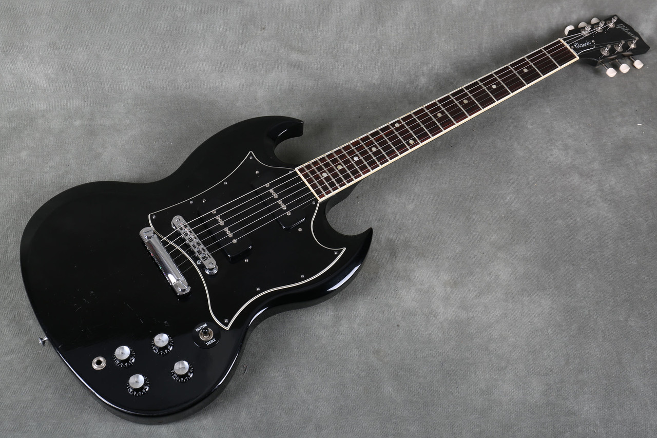 - Une GIBSON SG classic noire de 1999, montée avec des micro P90 qui font un malheur pour tout ce qui est old school