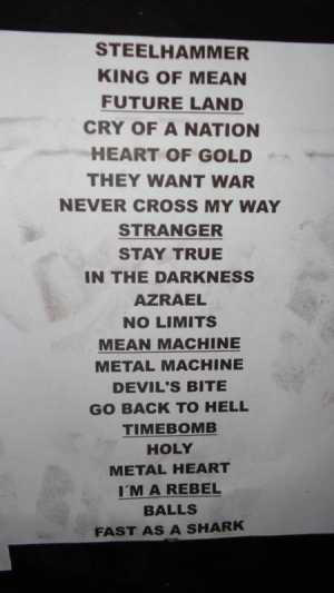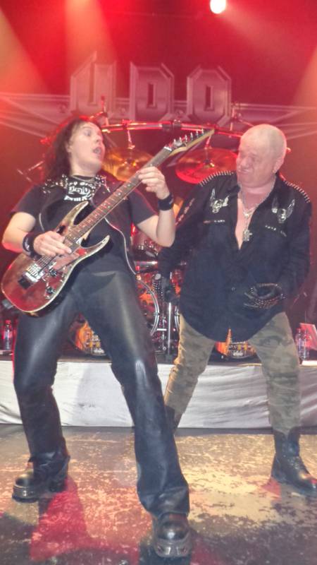 ZazPanzer - 07 February 2014: Merci Adrien. Tu n'as pas shooté le claviériste à la taille impressionnante ? Et où était posée la setlist ? Je ne l'ai pas vue pendant le gig. Sinon, soirée sympathique avec un UDO fatigué mais qui s'en sort bien, et des bons musiciens "génériques" si je puis m'exprimer ainsi : ça joue bien, mais on n'arrive pas à l'orteil de Wolf Hoffman ou de Mathias Dieth question feeling. C'est dommage qu'UDO se contente depuis des années de jouer avec un backing band au lieu d'avoir un vrai groupe. Enfin ça reste une opinion personnelle. C'est peut-être ça qui m'a empêché de me payer le K-Way UDO au merch' !