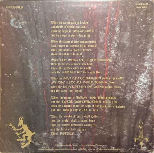 Quorthon déclara que Black Mark Productions étaient en fait une entité fantôme inventée de toutes pièces par le groupe pour faire croire que celui-ci avait une vraie maison de disques derrière lui et ainsi gagner en crédibilité. Ce n'est qu'en 1991-92 que Black Mark Productions serait devenu le véritable label que l'on connait aujourd'hui. Cela dit, si l'on prend en compte les incertitudes qui planent sur les premières années de la formation (notamment le rôle exact du producteur Börge “