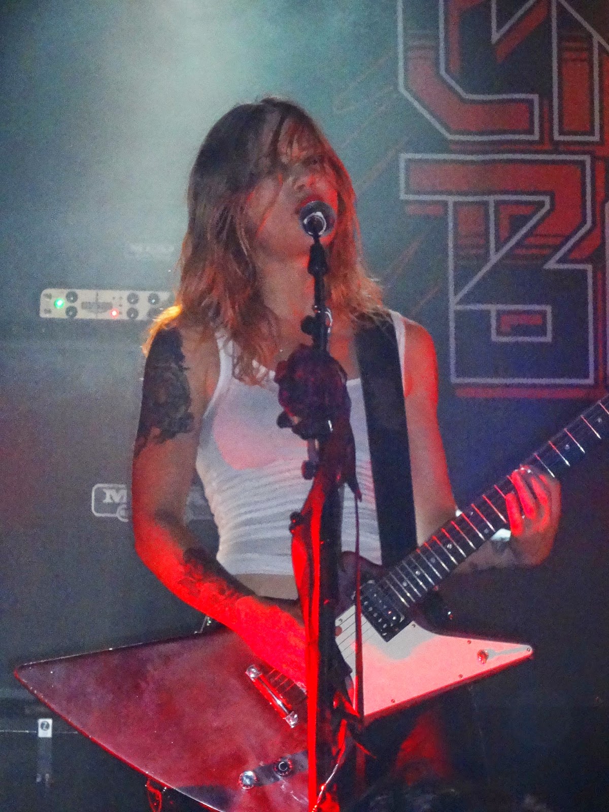 Le quatrième album des Crucified Barbara a mis tout le monde d’accord. Avec « In The Red », les Suédoises ont franchi un cap, entérinant un talent d’écriture qu’on pouvait déjà appréhender sur leurs matériels précédents. Je suis donc un peu surpris de constater que le Ninkasi Kao (capacité : 600 places) n’est pas sold out…Il est 21h45, le générique de Batman des sixties permet aux filles de prendre place dans la pénombre afin d’attaquer le set par « In The Red ». Seuls quelques lights rouges sang éclairent alors la scène. Elles paraissent déterminées, mais, sur les deux premiers titres, la guitare de Mia Coldheart est étouffée par la basse d’Ida Evileye ce qui gâche un peu mon plaisir. En tout cas, celui des yeux est intact : les girls ont vraiment la classe et incarnent à la perfection la Rock attitude version typesse. D’ailleurs, dans le public aussi la gente féminine est plus présente qu’à l’accoutumé…